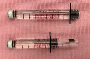 使用する麻酔の量も今は電動麻酔器を使用するので従来の約1/3になりました。(上が新品でひとメモリ約0,2ml×9で1,8ml、下は神経の治療後で6メモリ残っているので3メモリ分の0.6mlしか使っていません。昔は1本全部使わないとなかなか麻酔が効いてくれませんでした。)麻酔の薬はすぐに肝臓で代謝されて尿で排泄されますのでご安心ください。量が少ないに越したことはありません。